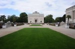 Across the bridge is the ruins of the abbey of Longchamp. I assume these are real ruins. To stop you going in there are hurdles and two trees in Versailles planters dumped in front (Fig. 16). Charming. After that you turn right and enter a circular space framed by little pavilions faming a view of the main pavilion, grandly called the Chateau (Fig. 17). This circular space is ringed by statues, apparently the originals judging from the weathering, which include the Belvedere Antinous (Fig. 18). But you can hardly see these because of big square boards placed in front of them, seemingly waiting for posters or something, or maybe to protect the statues from ball games or something. It makes you appreciate the National Trust. There is a cour d’honneur between this and the Chateau, with another building, the Trianon, along one side. The entrance to the Trianon had a blocking structure as well (Fig. 19). Peering into the Chateau you could see a sign saying they had guided tours at 3 pm every day, but it was 3 pm and obviously northing happening (Fig. 20). There is a parterre of tepid interest beyond, that, and other features on the north side, but I didn’t go there.