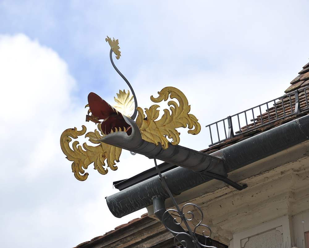 The Rathaus at Schwäbische Hall has some splendid dragon spouts (Fig. 1). The main channel is only half-round, with the top of the jaw completing it. It clarifies the ornamental ‘ears’. At Krakow there are both ‘ears’ and wings. Here there are no wings, only ornamental ‘ears’. These are set at 45 degrees just behind the jaw hinge, which means that from the front and necessarily below they are seen frontally (Fig. 2). In this was they make a strong visual statement: it avoids the awkward angle of views where the feature disappears because it is seen edge on. There is also a tail, somewhat unconvincing, a curved strip ending in an ornamental feature, and a pointed tongue that relates well to this (Fig. 3). All of this concentrates the features at one point, and doesn’t pretend to make sense of the dragon’s body, which is just the extended tube or semi-circular gutter. The inside of the mouth is painted red.