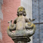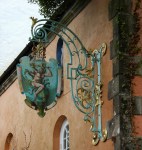 The concept of authenticity provides another way into addressing the seriousness or lack of it of Portmeirion. Here we see a design for the Peacock shop sign (c. 1955) (Fig. 10) and a sign showing Hercules and the Hydra on the Town Hall (Fig. 11), like one in the German Medieval-Renaissance town of Rothenburg-ob-der-Tauber (Fig. 12). We know that this sign was created by Clough and others to attract the (probably momentary) interest of a tourist. The shop sign in Rothenburg is not necessarily old, and could even be younger that Clough’s, but let us suppose it indeed dates from ‘the olden times’. Another example might be a statue of a Triton on a column at Rothenburg (Fig. 13), which is strikingly like the Portmeirion logo, a mermaid, exemplified by the cast-iron panels salvaged from the Sailor’s Home in Liverpool that are distributed around the village (Fig. 14).