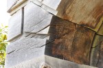 These buildings, like all the structures in this garden, are made from green oak. What takes a while to register is that they are made from whole tree trunks, some of which would have been huge. This is visible in the Inigo Gate (Fig. 1). The piers seen from the front are clearly made from a single slab, most clearly visible on the right (Fig. 1a). On the left the grain is more complex (Fig. 1b). These slabs do not seem to be radial – the core is probably on the inside. These slabs go half way through the thickness of the arch. On the inside face (Fig. 2) on the second level you can see the join between the front and back slabs. The central blocks on the first and third courses have a different grain: these are separate thin pieces that cross the join. They are attached by four nails, the heads of which are visible. These blocks rest on a plinth block (Fig. 3) that as far as I can tell is a single slab of wood.
