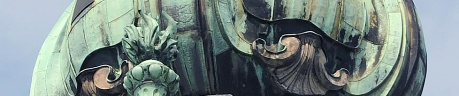 It makes little sense to call such a spire an onion dome. It forms part of a rich sequence of forms, going all the way down to a characteristically Baroque bell-tower with four concave arch forming a circle in plan, with projections responding to columns between them. Above the columns are supports for copper flaming urns, while the roof has characteristic Baroque hooded windows. The composition is highly sophisticated, and to my eyes one of the most successful performances of the theme. I particularly like the long ‘stem’ above the swelling, which ends up being perfectly straight and square in plan. The shape ends up more like a long-necked perfume flask. There are clearly articulated ribs defining the four corners, which a shallow cartouche on the wide surfaces (Fig. 2). These have curved details at the bottom like scallop shells, and shallow hoods or eyebrows at the top, which may serve to deflect rainwater to the corners. In the middle of the cartouche is something in a different material from the oxidised copper of the rest, perhaps a hatch.