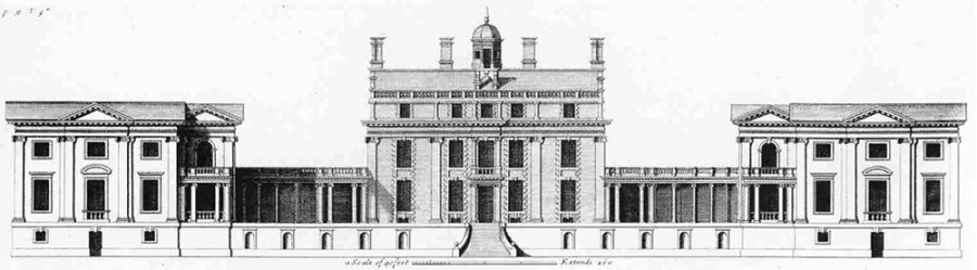 Fig. 1. Stoke Park, with the house and flanking pavilions, from Vitruvius Brittanicus.
