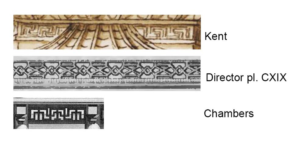 Fig 4. Meanders and chinese frets. Top: Kent; centre: Chppendale; bottom Chambers.