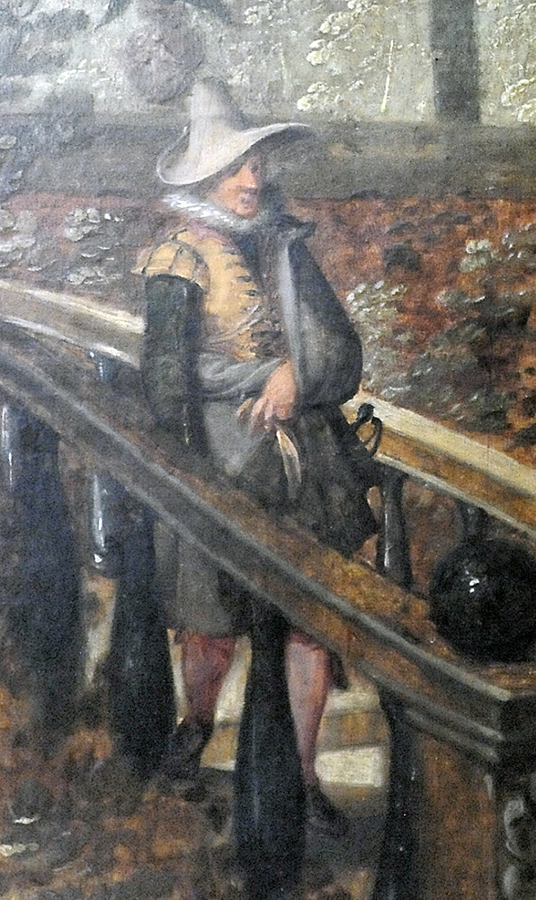 She holds hands with the man at the foot of the table, also wearing a ruff and doublet. He has his arm outstretched, as if in conversation, Corresponding to the woman with a ruff is man in a tall black hat, ruff and doublet. One is prompted to read him as a woman but the clothing is male. He has no obvious partner unless it is the woman opposite and the man at the foot of the table is unattached but making progress with the woman beside him. Next would be the couple by the parapet (Fig. 8).
