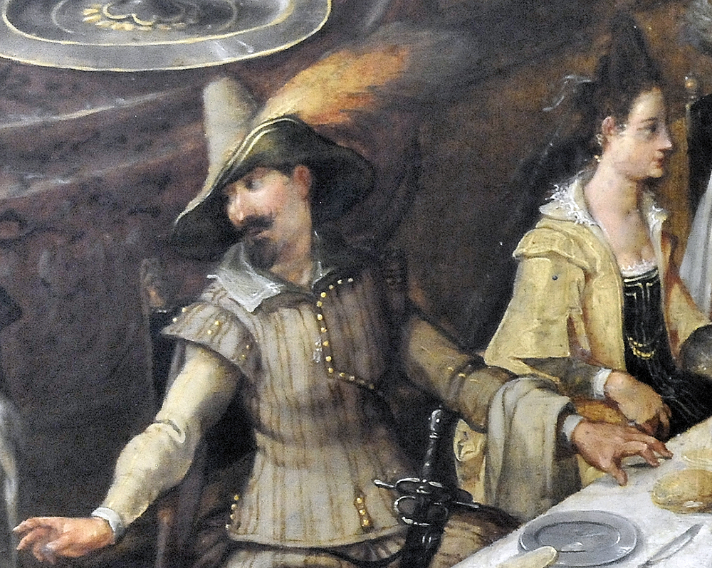 The woman was probably seated next to the foot of the table, which means that on either side of the foot of the table there would have been two pairs of women. The man wears a tall black hat, matching doublet and tunic-like breeches and a sword. Returning to the table, next comes a woman in blue and then the man to the right of his host, who wears a tall grey hat, leather doublet, and a roman-style leather(?) slashed skirt.