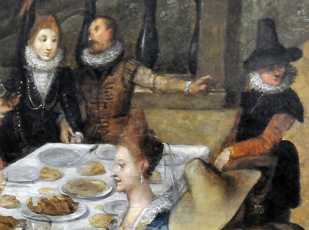 [1] Sebastian Vrancx (Antwerp, 1573 – Antwerp, 1647), An Elegant Company Dining Outdoors, c. 1610–1620. Oil on oak. 91 × 126 cm. Museum of Fine Arts, Budapest, Inv. 58.27. Image from the Museum website.