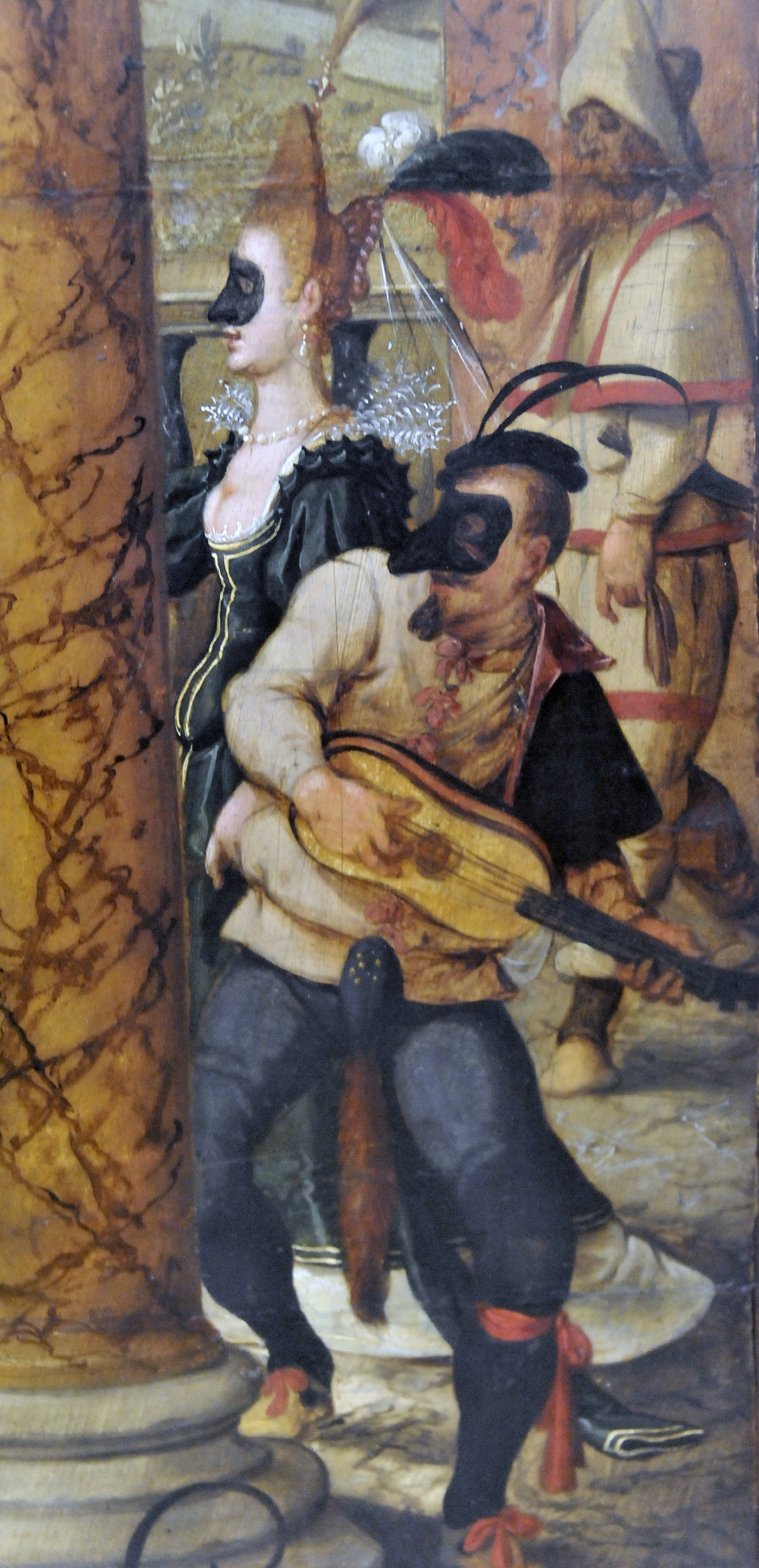 The party is being entertained by a troup of Commedia dell’Arte entertainers who emerge from a porch in the style of imaginary architects like Vredeman de Vries.[2] Between the columns of the porch is the Doctor (I think) (Fig. 11), behind him an Innamorata, Pantaloon, and at the side is a lute-Zanni) playing his lute like a rock star (Fig. 12).