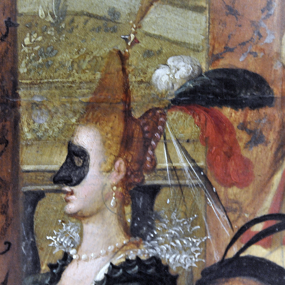 The most fascinating member of a troupe is a woman whose headgear is an extravagant, and perhaps trangressive version of the headgear of the two women nearest the head of the table, who must be aristocrats (Fig. 14). She is presumably the Innamorata, although in commedia dell’Arte the Innamorata is not normally masked.