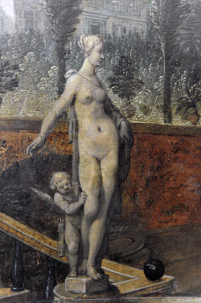 Her body displays a twist hat goes beyond classical contrapposto, and she displays it artfully displays using a cloak that is draped over her left arm and tied around her neck so that it falls down her back. Her hips are somewhat narrow, so that her right side forms a shallow undulating vertical line from armpit to Cupid. Her presence, of course, signifies hat it is a pleasure garden, as the acivities of the living figures make obvious. Matching her position at the base of the stairs us a statue of Apollo.