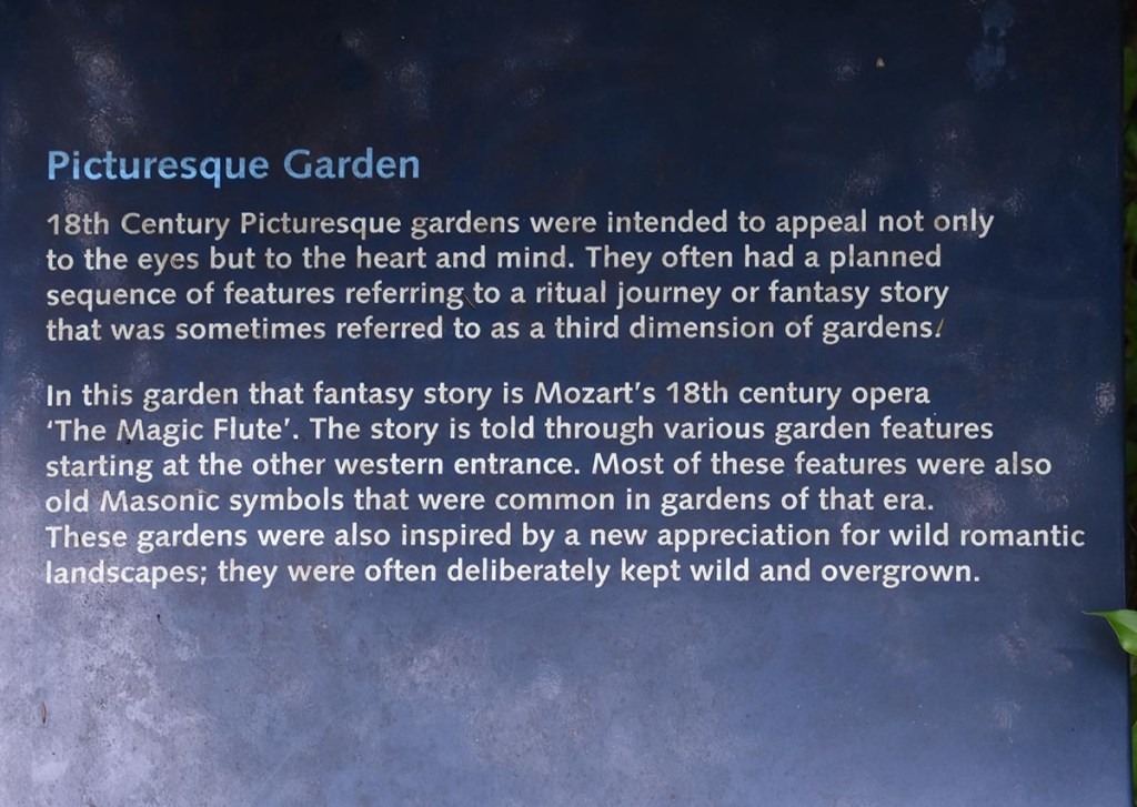 [1] The description of the Picturesque Garden from the Hamilton Gardens website is as follows: ‘The 18th century Picturesque Garden movement in England reflected a changing attitude to nature. / Rather than formality and control, garden design was inspired by the new fashion for paintings of wild, romantic landscapes. With banks of long grass, artificially aged structures, and respect for local flora, the Picturesque Garden movement made a revolutionary statement about the rigors of aristocracy. / These gardens were intended to appeal not only to the eyes, but to the heart and mind. Often they were deliberately kept wild and overgrown. / Within the naturalistic looking gardens of this era, there was often a sequence of features that referred to a fantasy story or classical legend. A recurrent theme was a ritual journey where an individual’s character is tested. / The Picturesque Garden at Hamilton Gardens makes reference to the story of The Magic Flute. Written by Wolfgang Amadeus Mozart in 1791, just months before his death, the fairy tale opera tells of a hero’s journey through trials to enlightenment and love. / Along with many other influential thinkers of the time, Mozart was a Mason. His fantasy-filled opera is laden with Masonic symbols, which were also commonly found in garden designs of that period. Symbolism that can found in our garden varies from lions and sphinxes to Palladian pavilions and the three forms of classical pillar. / The fashion for the Picturesque was at its peak in author Jane Austen’s time. “A prettyish kind of wilderness” (as she put it in her novel Pride and Prejudice) was highly sought after. This style of landscape architecture became widely popular outside of England too, from Stockholm and Naples to St Petersburg and the Hudson Valley. / … / Hamilton Gardens has an internationally unique concept: it tells the story of gardens through different periods and different civilisations. This garden is an important addition to the collection of gardens because the Picturesque Garden movement was a significant stage in the evolution of modern landscape architecture.’