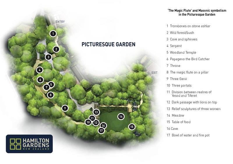 The Hamilton Gardens garden recognise that there is another garden style beside the Chinese that relies on a linear itinerary, the picturesque landscape garden. At Hamilton this is done in an interestingly and quite original way by making a scenographic itinerary that recreates the Magic Flute and its Masonic symbolism.[1]