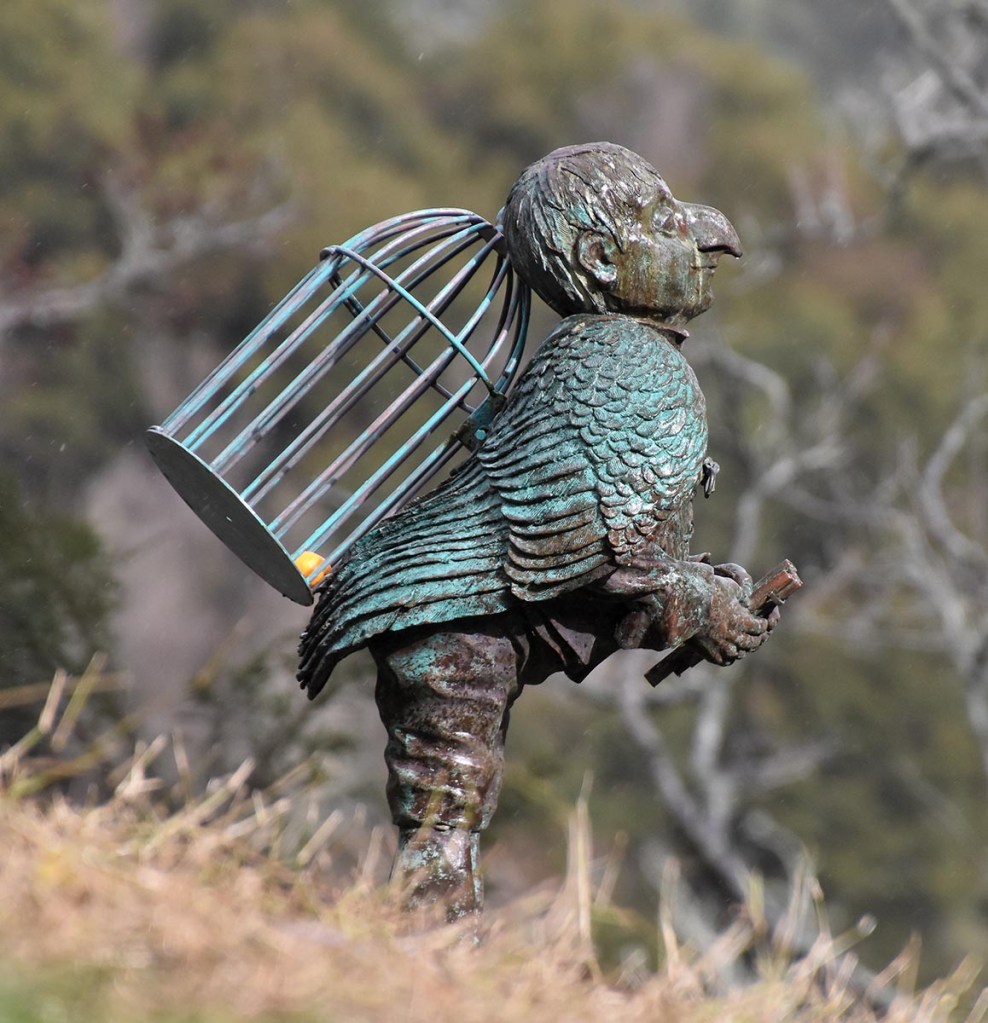 The curious figure of Papageno the Bird Catcher appears. He’s half man and half bird, with a birdcage on his back.