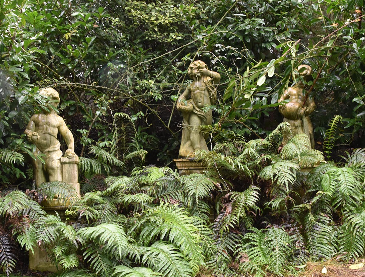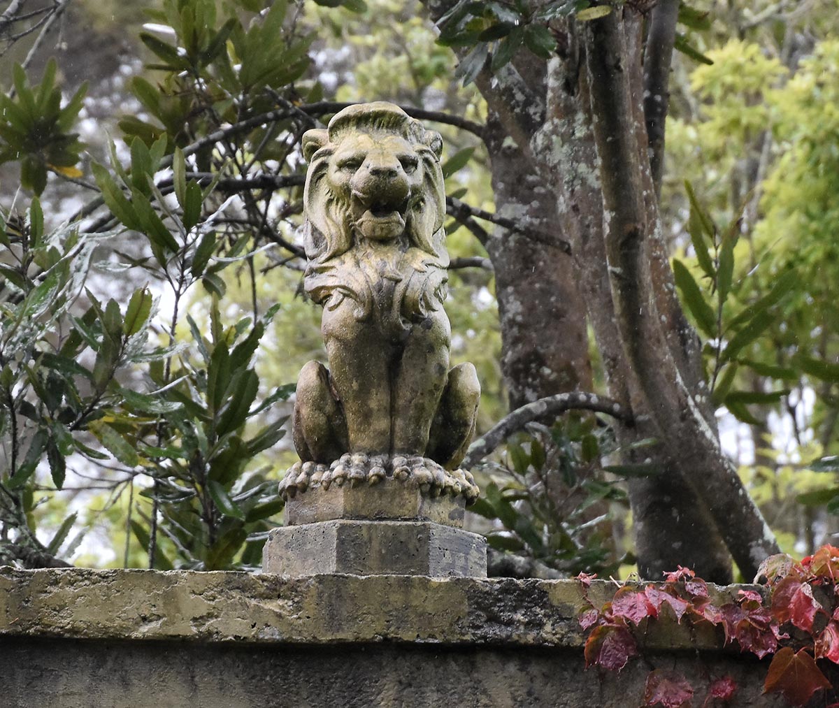 By establishing a narrative that follows in detail an opera the garden prompts memories of that opera, if you happen to have seen it. Because it is opera, what one recalls is powerful singers belting out famous arias, above all the Queen of the Night’s aria, but also ‘Pa-Pa-Pa-Papagena’ and Sarastro’s booming bass. But at Hamilton what you are most aware of is the absence of the protagonists. While there is a statue of Papageno in bronze, (Fig. 4),[6] and the three boys appear as three putti (Fig. 5), Sarastro and the Queen of the Night are absent in the form one expects them to take: impressively costumed human figures. Without the program one would never realise that some small statues of lions on the wall of the portals represent Sarastro: ‘Sarestro [sic] appears riding a chariot drawn by six lions (who sit on the top of the wall)’ (Fig. 6). Because you are primed by Papageno and the Three Boys to expect representations of the protagonists of the opera, this shift to allusiveness goes unremarked. Only on second viewing did I get the point that the throne in front of the Temple was the Queen of the Night’s throne and her presence, sitting on it, was implied. And the statue of Papageno is simply too small and lacking in the scale and presence needed for a garden.