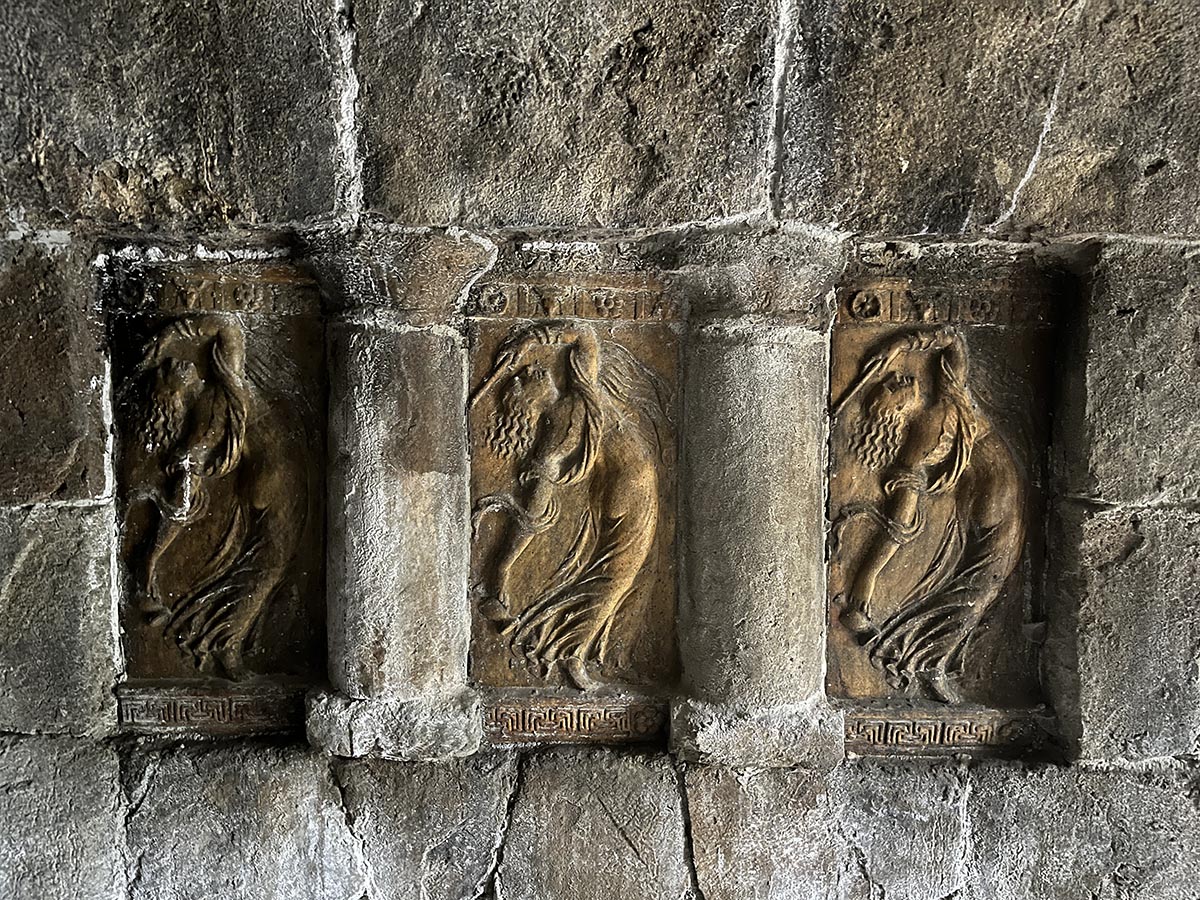 Within the dark passage Tamino and Papageno undergo their first test ‘to resist in silence the guiles of women’. Three rather frisky looking women are represented in relief sculpture on the wall.