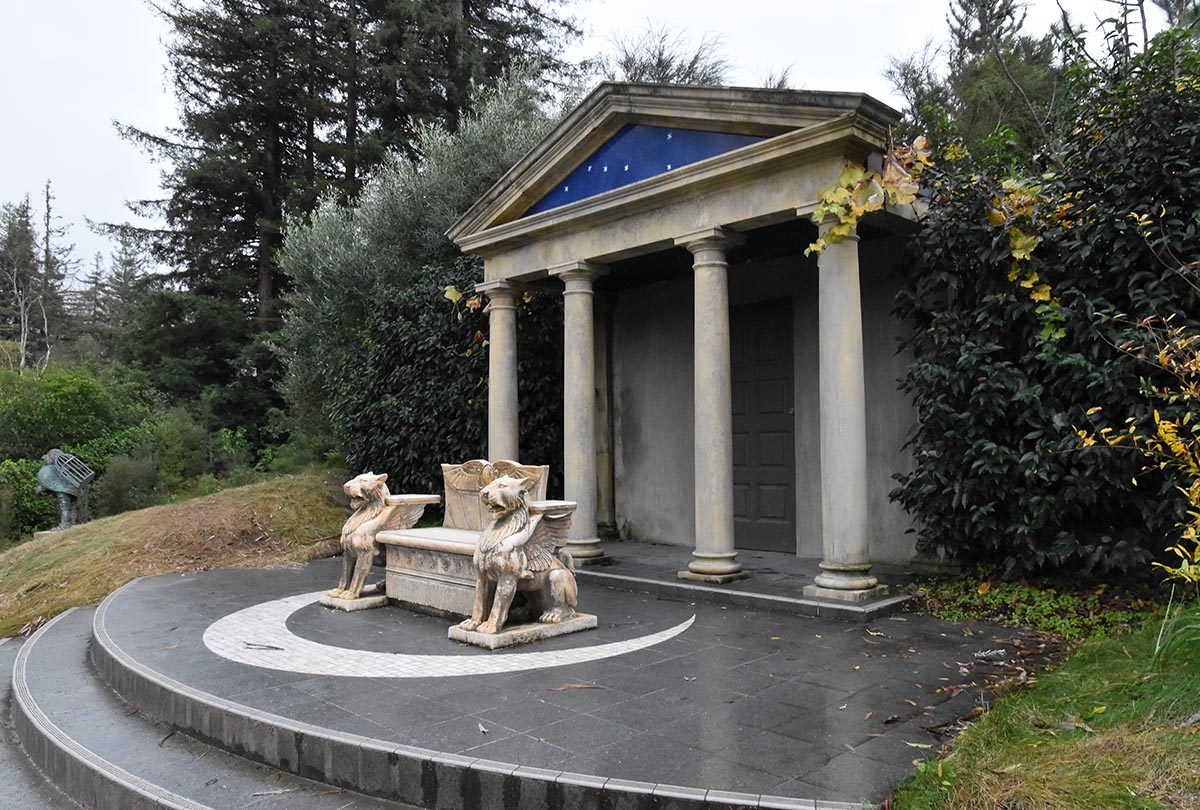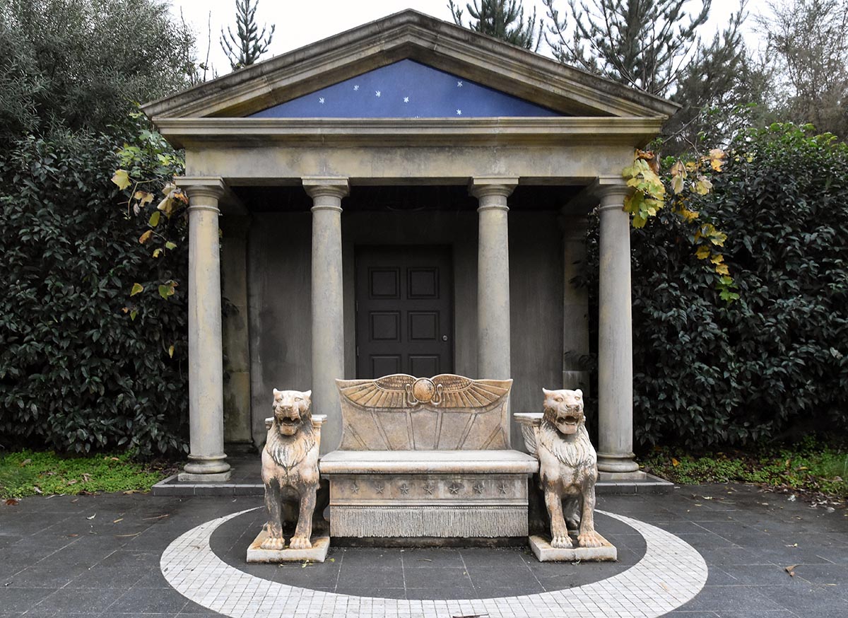 It may be worth reimagining this garden as one that makes its points through architectural features that are individually allusive but diverse in theme or only loosely grouped thematically; in other words, a garden of fabriques, which in many ways more true to the picturesque garden tradition. The Temple of the Queen of the Night works well in this regard (Figs 15, 16). It is appropriate to an historical picturesque garden in that the default garden feature of such gardens is a classical temple, and the scale is good. So too is the architectural detail, presumably because this is a stock item available from a manufacturer somewhere. The painted stars and Egyptian details introduce the Magic Flute theme, made suitably explicit by the bronze flute on a broken column. The emptiness of the throne provides a deeper level of allusion, which one eventually realises implies the absent presence of the Queen of the Night. Simply naming it the Temple of the Queen of the Night is all the programming that is needed. If you have even only a slight acquaintance with the opera, all falls into place, if not necessarily immediately. If you don’t, your interest is piqued. That is how fabriques work.