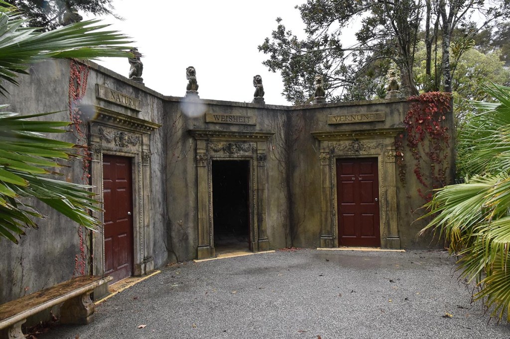 [8] Hamilton Gardens website: ‘Tamino and Papageno have a choice of three portals by which to enter the temple: Vernunft (reason), Weisheit (wisdom) or Natur (nature). The design of this wall was based on Mozart’s own set design for The Magic Flute.’