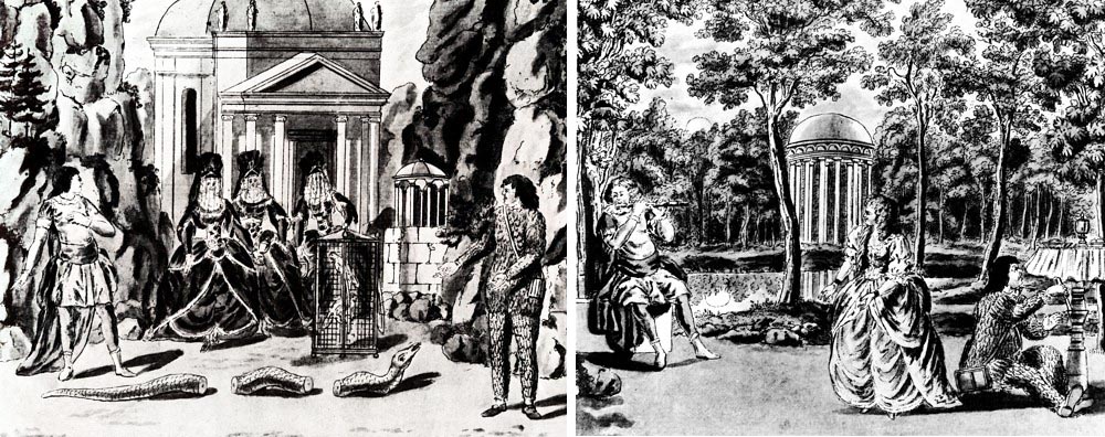 Carmontelle was a theatre designer, and his garden is overtly a piece of theatrical entertainment, intended to be far more interesting than mere nature. It had a unidirectional itinerary, a variety of episodes, and Masonic allusions. The Hamilton garden is similarly unidirectional. If you approach it from the wrong end you are politely encouraged to go around the other way. At Parc Monceau, as in other picturesque gardens of fabriques, there is an attempt to represent ‘all times and places’ through discrete fabriques alluding to specific times or places, each is independent of the other.[4] At Hamilton, by contrast, the sequence of features is controlled by an iconographic program: Mozart’s opera, the Magic Flute (Fig. 2).