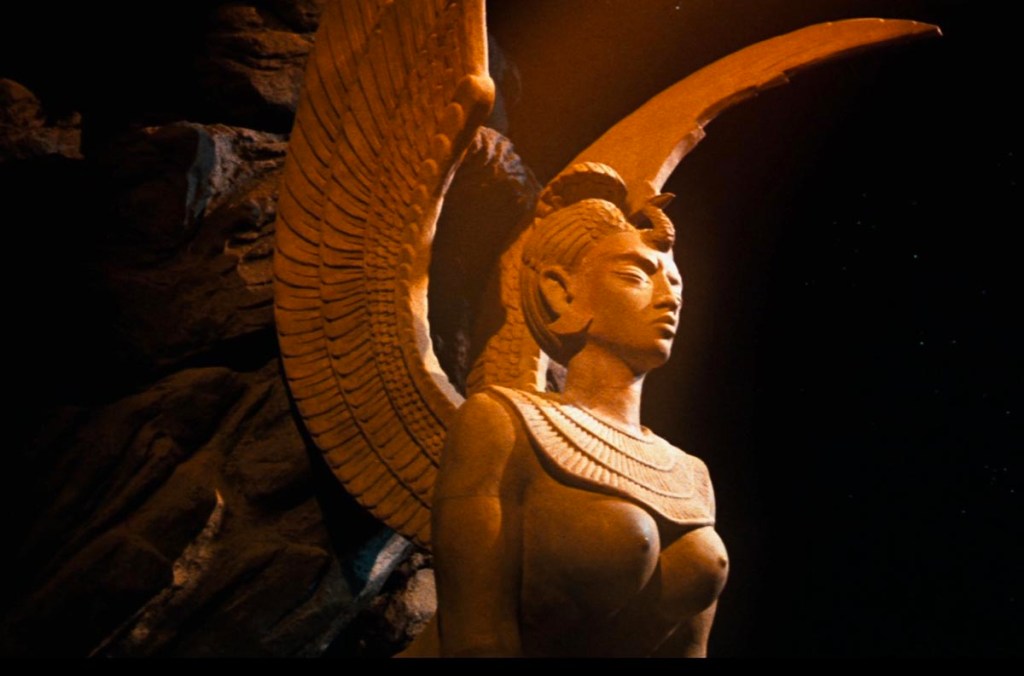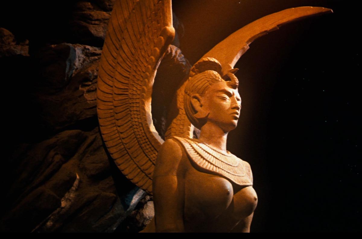 However, because of the straightjacket of the Magic Flute theme they cannot utilise their more interesting associations. We are told that ‘sphinxes typically suggest this story is set in Egypt. These mythological creatures were also a Masonic symbol’. But these are in fact Theban sphinxes which have a woman’s face, but not, as is usually the case, winged and sitting on its haunches. The Theban sphinx bars the passage of the hero, Oedipus, who has to answer a riddle (Fig. 27).[10]